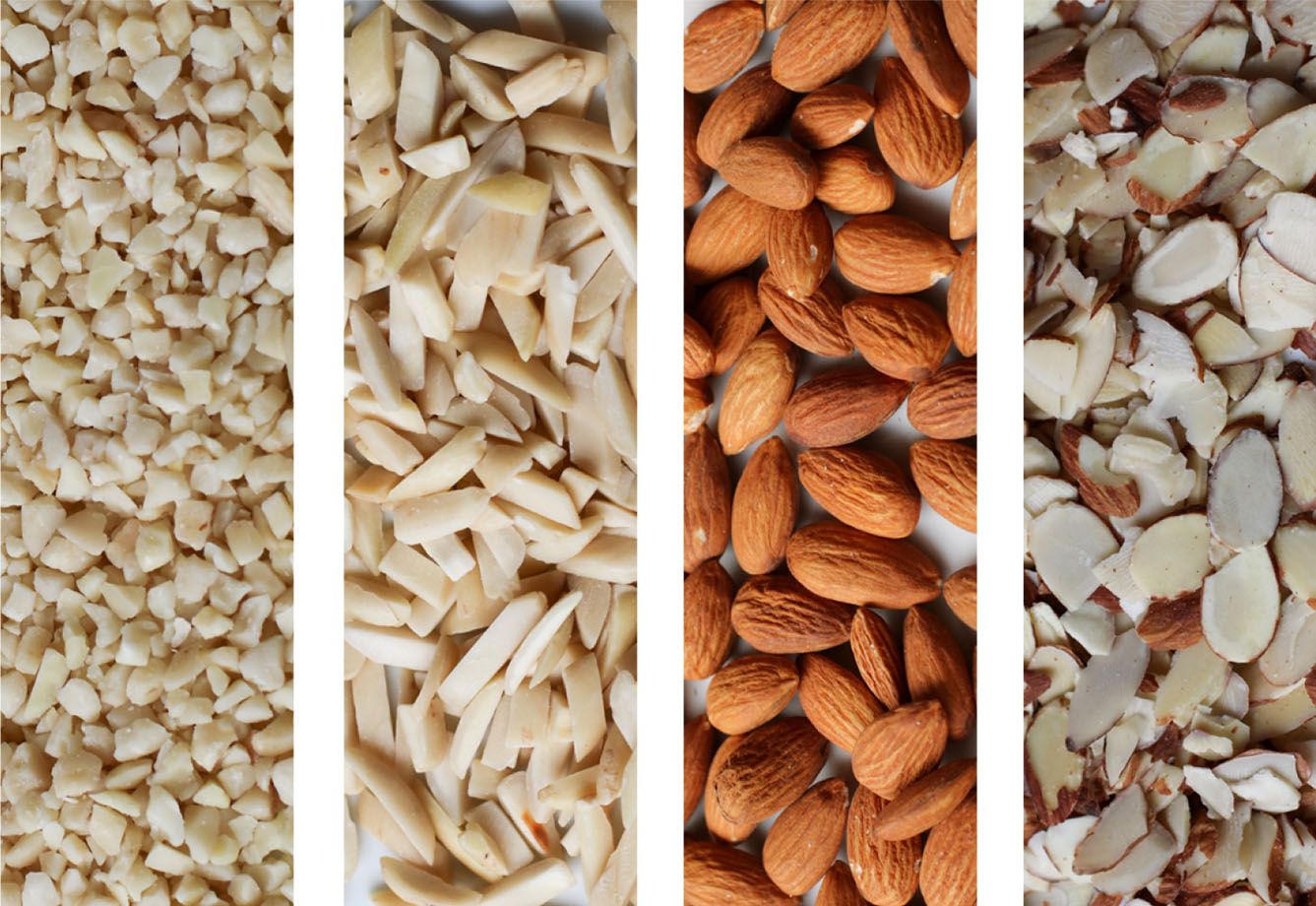 Frutos secos en diferentes formas que agrega características sensoriales en pastelería y/o repostería.